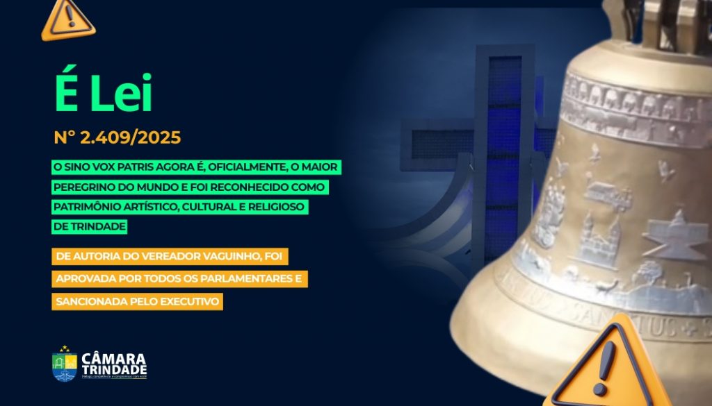 O Sino Vox Patris, símbolo consagrado da fé católica em Trindade, acaba de receber reconhecimento oficial por meio da Lei nº 2.409, sancionada em 26 de maio de 2025. A norma declara o sino como o “maior peregrino do mundo” e o reconhece como patrimônio artístico, cultural e religioso do município. O projeto é de autoria do vereador Vaguinho e foi aprovado por unanimidade pela Câmara Municipal.