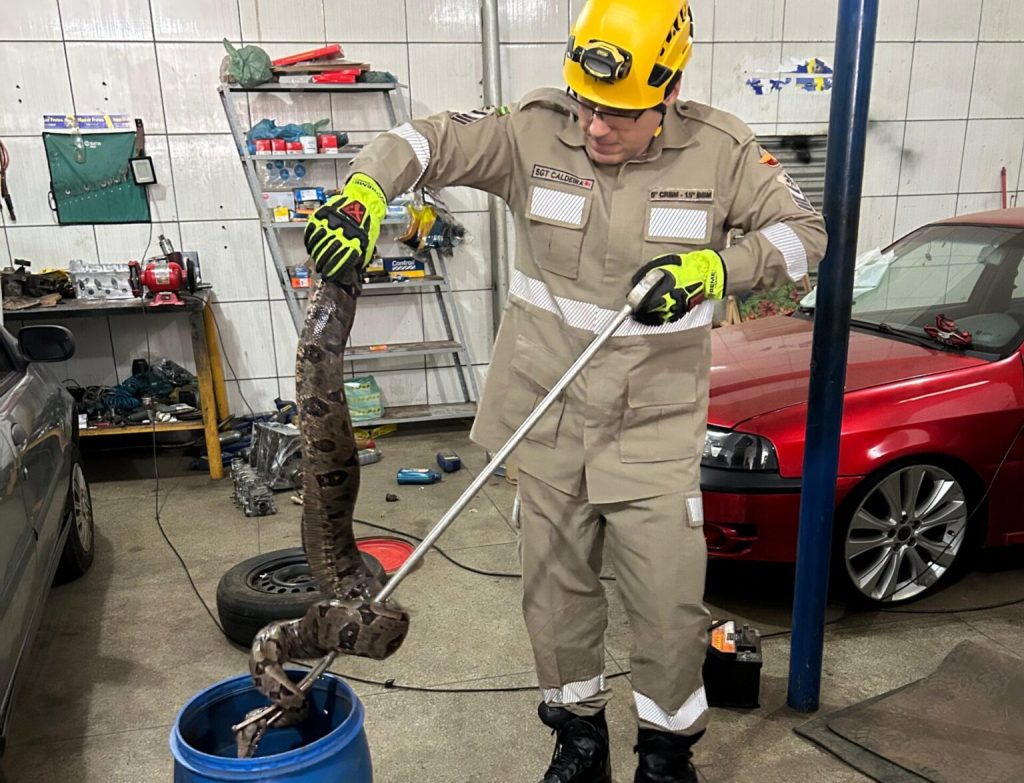 Uma jiboia foi resgatada pelo Corpo de Bombeiros de dentro de uma oficina mecânica nesta quinta-feira, 12, em Trindade. O animal, de mais de 1,5 metros, assustou os funcionários do local, que se surpreenderam com a serpente ao abrirem a oficina no Setor Maysa.