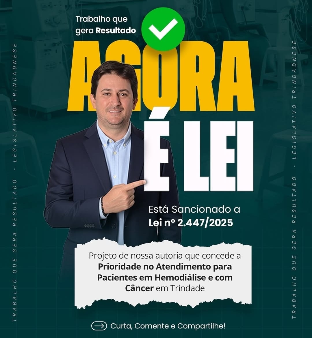 Trindade dá mais um passo importante na área da saúde e no cuidado com as pessoas que mais precisam. A cidade agora conta com a Lei nº 2447/2025, de autoria do Presidente da Câmara Municipal, Maurinho de Paula, que assegura atendimento prioritário a pacientes em tratamento de hemodiálise e com câncer. A proposta, aprovada por unanimidade pelo Legislativo, foi sancionada pelo Prefeito Marden Júnior, reforçando o compromisso da gestão municipal com a dignidade e o bem-estar da população.