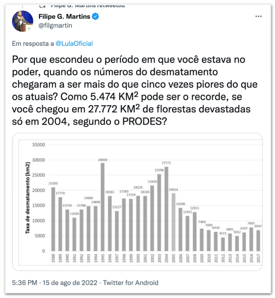 Depois de Lula apagar a mensagem, Martins reagiu. “Lula tentou espalhar mais uma mentira, alegando que 2022 bateu o recorde de desmatamento”, escreveu o assessor especial. “Quando demonstrei que ele estava mentindo e que o desmatamento durante o governo dele chegou a ser cinco vezes maior que o atual, ele correu para esconder a prova de que estava mentindo.”