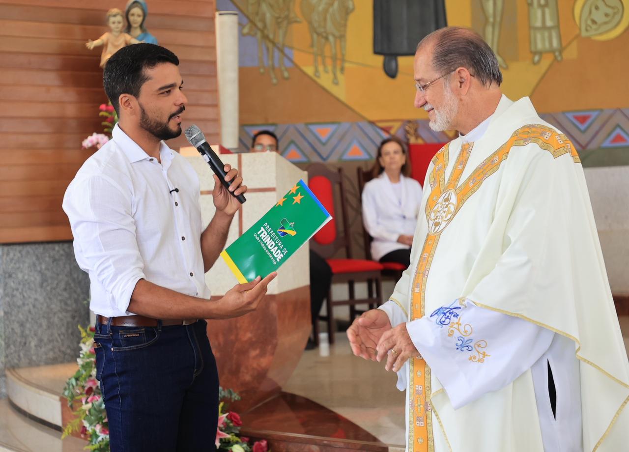 A Prefeitura de Trindade, por meio da Secretaria Municipal de Planejamento Urbano, Habitação e Regularização Fundiária, concretizou no último domingo (23/11) mais um importante avanço em sua política de regularização fundiária. Durante a missa de encerramento da tradicional Festa em honra ao Venerável Padre Pelágio, foi entregue ao Reitor da Igreja Santíssimo Redentor, Padre Walmir Garcia, o documento que oficializa a posse definitiva do terreno cedido ainda na gestão do ex-prefeito Valdivino Chaves.