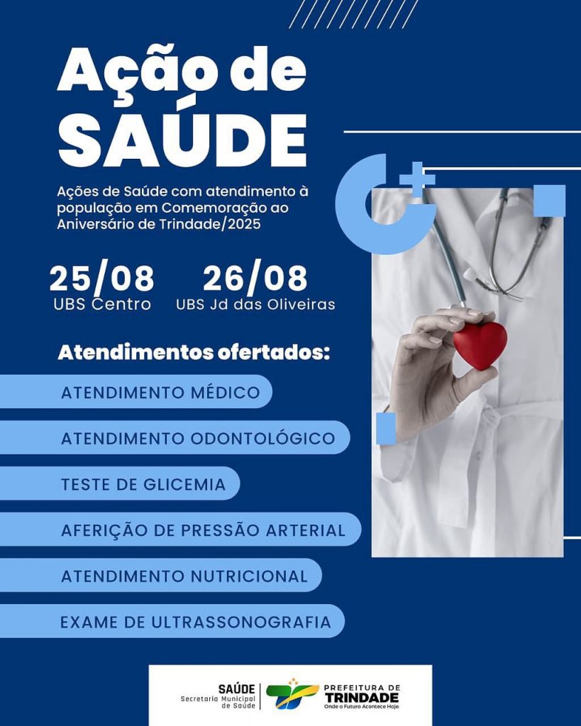 A Prefeitura de Trindade, por meio da Secretaria Municipal de Saúde, promove nos dias 25 e 26 de agosto, hoje e amanhã, uma ação especial de saúde em comemoração ao aniversário do município. Os atendimentos gratuitos serão realizados em duas Unidades Básicas de Saúde(UBS), com foco na prevenção, bem-estar e ampliação do acesso aos serviços de saúde.
