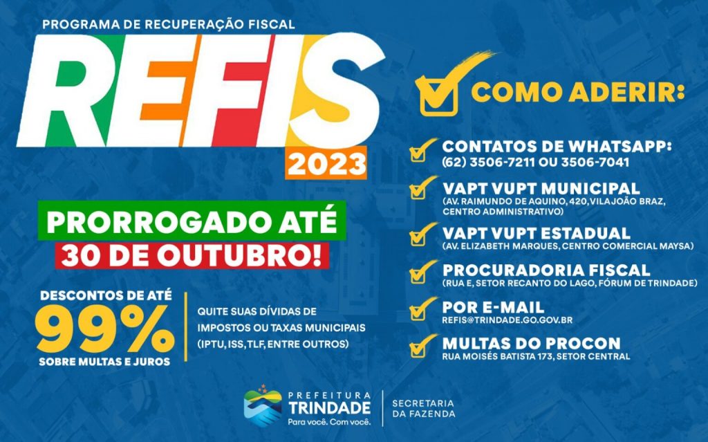 A Prefeitura de Trindade prorrogou o prazo da segunda edição do Programa de Recuperação Fiscal (Refis) 2023, para o dia 30 de outubro. Os contribuintes com dívidas tributárias junto ao município (ISS, TLF, IPTU, ITU, entre outros) terão opções para que possam aderir ao benefício. Os descontos em multas e juros de débitos fiscais variam de 99% a 60%. O pagamento pode ser parcelado em até 36 vezes.