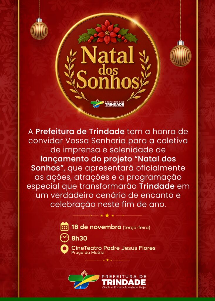 Trindade vai viver um Natal histórico. O prefeito Marden Júnior lança, nesta terça-feira (18/11), às 8h30, no Cine Teatro Padre Jesus Flores, o projeto Natal dos Sonhos, iniciativa que promete envolver toda a cidade em um grande circuito de luz, fé, arte e experiências voltadas às famílias trindadenses e aos visitantes.